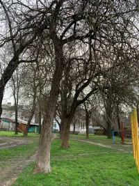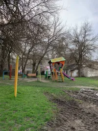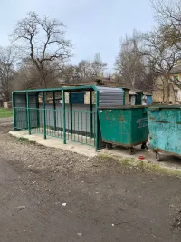На территории, которая находится в глубине двора, есть детская площадка. Неподалеку находится площадка для мусорных контейнеров. Она пустая. Сами мусорные контейнеры стоят рядом.