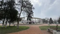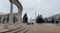 Световой туннель, украшения на деревьях и шар в сквере «Монеточка» еще не убрали.