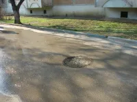 Канализационный колодец возле рынка на сей раз сухой, канализационный колодец рядом, на дороге, - протекает.