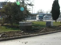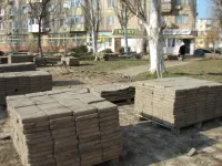 На объект благоустройства завозят новую плитку, старую складируют и увозят.
