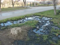 КерчьФМ побывал у дома № 13 по улице Ворошилова и убедился: стоит на газоне зловонная лужа. Неподалеку - канализационный колодец.