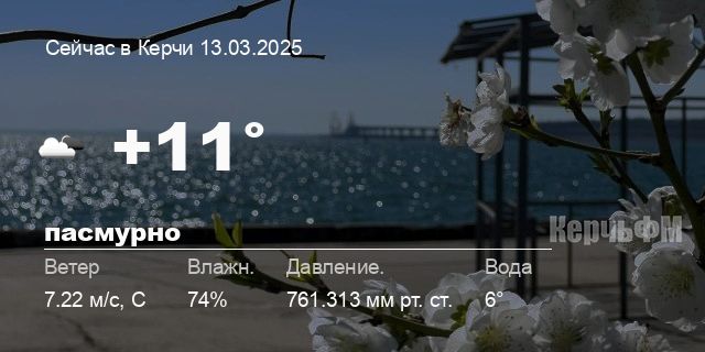 Сегодня днем в Керчи, 13 марта, ожидается пасмурная погода, температура воздуха от +8.8° до +11.6°С, ветер северный 6.84 м/с, порывы до 7.93 м/с, давление 759.8 мм рт. ст., влажность 71%.