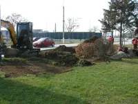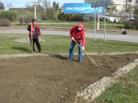 Как рассказал мастер бригады подрядчика "Грифон" Александр, в начале техника снимает грунт, потом рабочие разравнивают землю и делают газон красивым, и без стоков грязи на дорогу после дождей.
