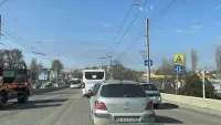 Перекрыта полоса в сторону автовокзала.Автомобили стоят в пробке перед светофором более 10 минут днем.