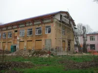 Территория огорожена металлической сеткой и видно, что ведутся строительные работы...