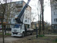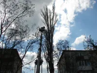 С помощью 40-метровой вышки рабочие Зеленхоза ведут спил аварийных веток высокого тополя у дома № 19.