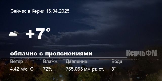 Сегодня днем в Керчи, 13 апреля, ожидается малооблачная погода, температура воздуха от +5.2° до +8.6°С, ветер северный 4.99 м/с, порывы до 6.26 м/с, давление 766.6 мм рт. ст., влажность 65%.