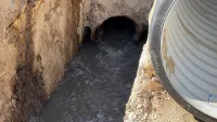 На дороге лежат трубы и вырыта траншея. А вот в ней распиленная труба, из которой напором вытекают нечистоты в грунт. Водоканал осознано все так бросил и загрязняет грунт? На улице стоит стойкий неприятный запах.