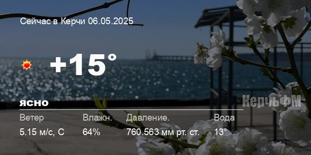 Сегодня днем в Керчи, 06 мая, ожидается ясная погода, температура воздуха от +11.3° до +16.9°С, ветер северный 6.21 м/с, давление 760.6 мм рт. ст., влажность 57%.