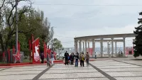 Керчане пришли с флагами и портретами своих погибших родственников. На площади Ленина играет патриотическая музыка. Горожане фотографируются у новых инсталляций.