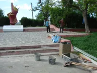 Территорию вокруг памятного знака "Факел" выложили тротуарной плиткой, сам Факел покрасили.