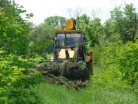 Помимо всего, через заросшую территорию бульдозер прокладывает дорожки, где будут обустроены боковые подходные тротуары, ведущие к центру парка.