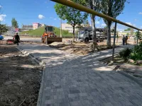 Параллельно продолжается установка бордюров, укладка плиточного покрытия и подготовка дальнейшего основания для мощения тротуаров.