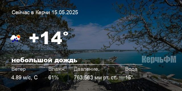 Сегодня днем в Керчи, 15 мая, ожидается ясная погода, температура воздуха от +10.8° до +16.1°С, ветер северный 7.04 м/с, давление 763.6 мм рт. ст., влажность 54%.