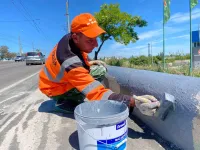 Также рабочие Службы городского хозяйства окрашивают ограждения перехода через реку Мелек-Чесме рядом со школой №4.