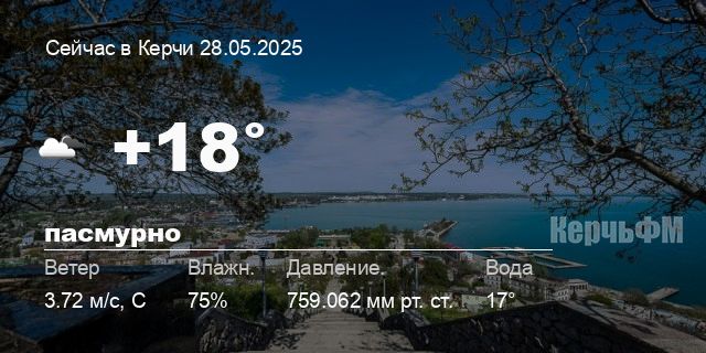 Сегодня днем в Керчи, 28 мая, ожидается пасмурная погода, температура воздуха от +15.9° до +19.6°С, ветер северный 4.93 м/с, порывы до 5.19 м/с, давление 759.1 мм рт. ст., влажность 62%.