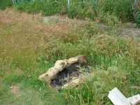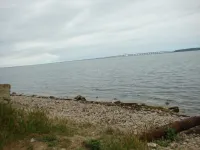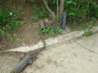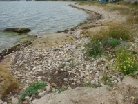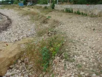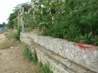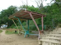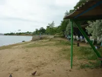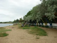 Из трех спусков целым остался лишь один, размытый берег, камни, разрушенная беседка, допотопные раздевалки, поросль внизу и заросли сверху. Полное отсутствие песка.