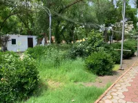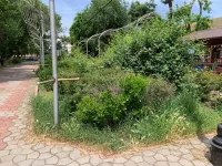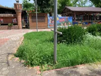 Отметим, что местами в парке трава скошена. У кафе и рядом с атракционами на клумбах относительный порядок.