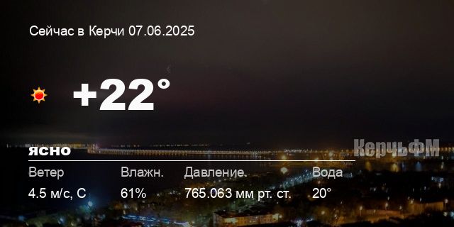 Сегодня днем в Керчи, 07 июня, ожидается ясная погода, температура воздуха от +18.8° до +23.7°С, ветер северный 4.53 м/с, порывы до 4.82 м/с, давление 765.1 мм рт. ст., влажность 53%.