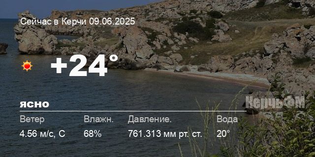 Сегодня днем в Керчи, 09 июня, ожидается ясная погода, температура воздуха от +21.4° до +27°С, ветер северный 5.49 м/с, порывы до 4.78 м/с, давление 760.6 мм рт. ст., влажность 61%.