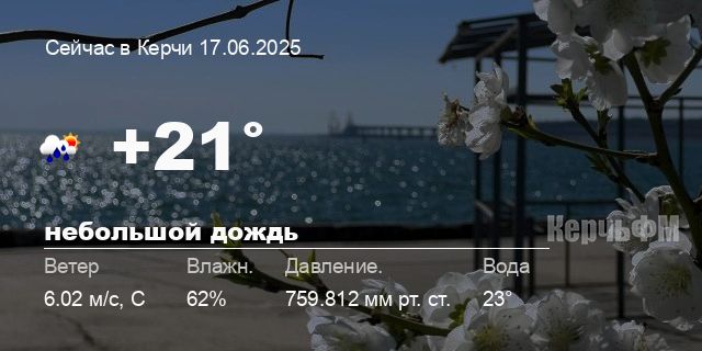 Сегодня днем в Керчи, 17 июня, ожидается ясная погода, температура воздуха от +18.1° до +23.9°С, ветер северный 3.7 м/с, порывы до 7.13 м/с, давление 760.6 мм рт. ст., влажность 55%.