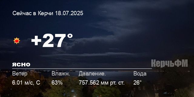 Сегодня днем в Керчи, 18 июля, ожидается ясная погода, температура воздуха от +23.2° до +30.2°С, ветер северный 5.94 м/с, порывы до 6.01 м/с, давление 756.8 мм рт. ст., влажность 54%.