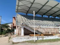 На западной и восточной трибунах установили новую кровлю из профнастила.