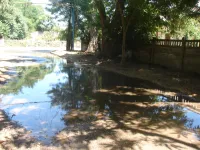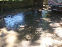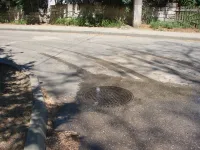 Из под люка вода бьет двумя фонтанами и растекается по дорогам вдоль домов частного сектора.