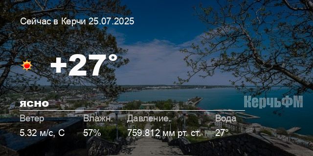 Сегодня днем в Керчи, 25 июля, ожидается ясная погода, температура воздуха от +24.7° до +28.9°С, ветер 3.29 м/с, порывы до 5.32 м/с, давление 759.8 мм рт. ст., влажность 47%.