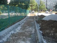 На центральной аллее укладку бордюров начали от школы и дошли уже до Спортивной школы олимпийского резерва по художественной гимнастике.