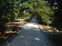 После укладки в грунт электрического кабеля для новых опор уличного освещения, у садика установили вдоль тротуара бордюры и засыпали его щебнем.