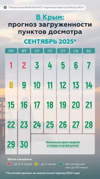 Оперативный канал "КРЫМСКИЙ МОСТ" опубликовал прогноз загруженности пунктов досмотра на въезд и выезд из Крыма в сентябре 2025 года. Информация основана на данных за аналогичный период 2024 года и предназначена для того, чтобы помочь водителям заранее спланировать поездку и избежать длительных ожиданий. Керчане и гости города предлагаем вам ознакомиться с ним, - передает КерчьФМ