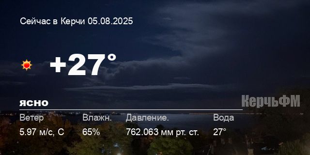 Сегодня днем в Керчи, 05 августа, ожидается ясная погода, температура воздуха от +24.5° до +27.7°С, ветер северный 5.53 м/с, порывы до 5.97 м/с, давление 762.1 мм рт. ст., влажность 57%.