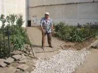 С одной стороны подход к тротуару вчера засыпали гравием. С другой стороны настил положили кое-как, разбросав по бокам плитку и камни.