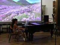 Прежде чем гостям выставки были представлены шедевры золотых рук автора, они смогли оценить ее виртуозное мастерство игры на рояле. Музыкальные композиции были исполнены на фоне фотографий не менее изумительных крымских пейзажей.