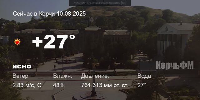 Сегодня днем в Керчи, 10 августа, ожидается ясная погода, температура воздуха от +24.1° до +27.6°С, ветер северный 4.99 м/с, порывы до 4.61 м/с, давление 764.3 мм рт. ст., влажность 46%.