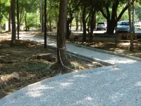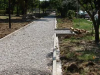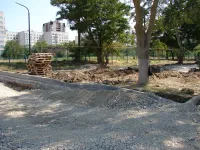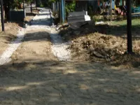 На других участках продолжается установка бордюров, отсыпка основания пешеходных дорожек щебнем.