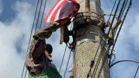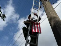 На улице Чкалова специалисты Службы городского хозяйства выполняют замену флажков на столбах освещения.