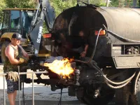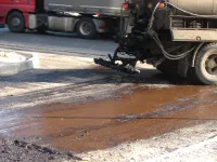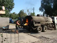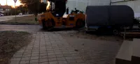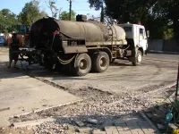 Асфальт укладывают вплотную к бордюрам после того, как спецмашина гудронатор разольет равномерно по дороге подогретый битум.