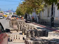 Строители продолжают демонтаж старой тротуарной плитки на улице Козлова.