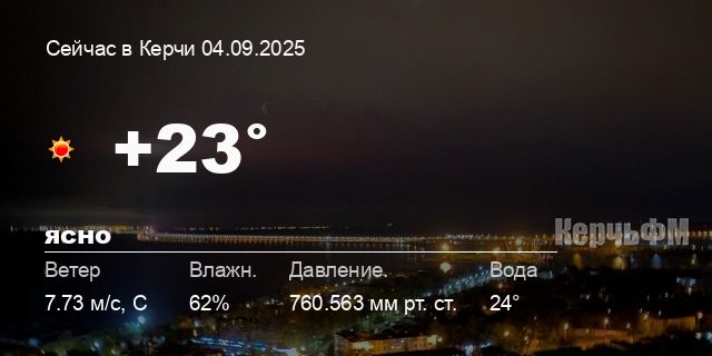Сегодня днем в Керчи, 04 сентября, ожидается ясная погода, температура воздуха от +22.7° до +26.1°С, ветер северный 7.76 м/с, давление 761.3 мм рт. ст., влажность 58%.