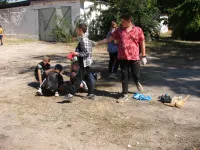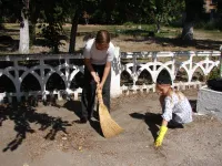 У школы № 17 ученики удаляли проросшую траву между тротуарными плитами, расчищали газоны от опавшей листвы, подрезали отросшие ветки на низкой высоте, подметали дорожки, расчищали свой небольшой стадион.