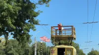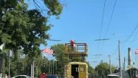 В Керчи над центральными дорогами продолжают развешивать флажки, - передает КерчьФМ. В конце рабочей недели работы шли по улице Кирова, здесь украшали троллейбусные линии.