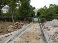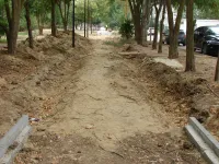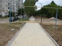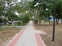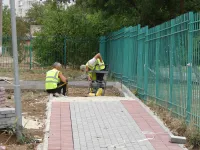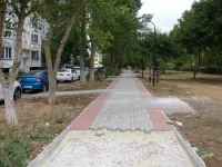 На аллее, ведущей от улицы Андрея Первозванного к школе №26, начали продвигаться работы по укладке нового тротуара.