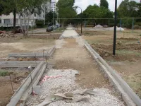 Вдоль "Спортивной школы олимпийского резерва по художественной гимнастике" тротуар уже выложен, и обустраиваются заезды, которые разрывают аллею в двух местах.