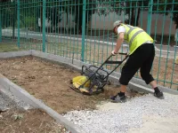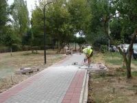 Продолжается укладка плитки на отрезке аллеи вдоль тыловой части детского сада.