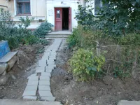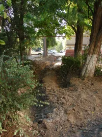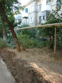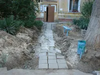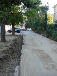 Устроители сняли тротуарные плиты на бельевых площадках, подготавливая территорию к зонированию и разметке.