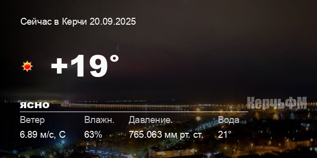 Сегодня днем в Керчи, 20 сентября, ожидается ясная погода, температура воздуха от +17.6° до +20.4°С, ветер северный 7.17 м/с, порывы до 7.31 м/с, давление 765.1 мм рт. ст., влажность 66%.