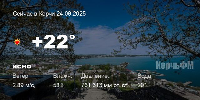 Сегодня днем в Керчи, 24 сентября, ожидается ясная погода, температура воздуха от +17.6° до +23.8°С, ветер 3.02 м/с, порывы до 3.92 м/с, давление 760.6 мм рт. ст., влажность 58%.
