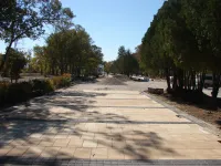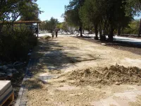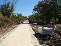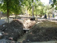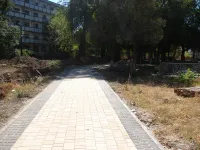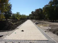 На пешеходной дорожке вдоль политехнического техникума также укладывается новая тротуарная плитка.